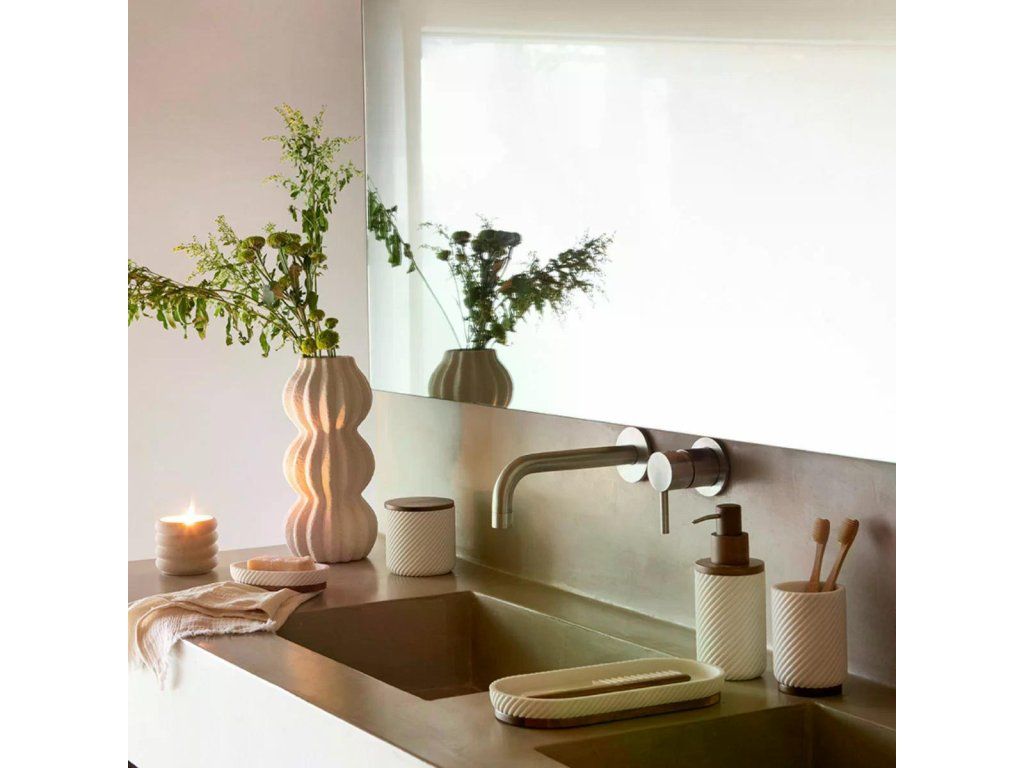 Ideálně ho doplňte kelímkem na zubní kartáčky, mýdlenkou nebo úložným táckem ze stejné série. Kombinace polyresinového těla a dřevěných detailů vytvoří vyvážený a nadčasový set, který obohatí jak moderní, tak přírodně laděné koupelny.