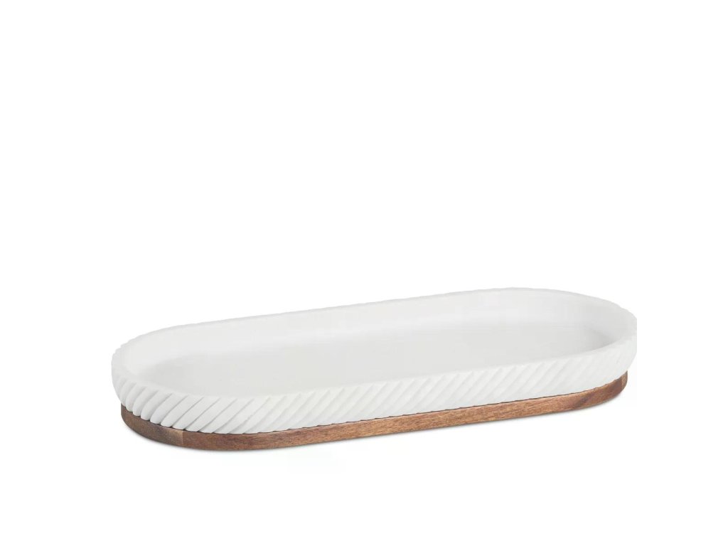 Tento stylový oválný podnos v kombinaci matného bílého polyresinu a přírodního akáciového dřeva je praktickým i estetickým doplňkem do koupelny i dalších částí interiéru. Jemné rýhování po obvodu dodává podnosu moderní, čistý vzhled, zatímco dřevěná základna vnáší do prostoru teplo a přirozený akcent.