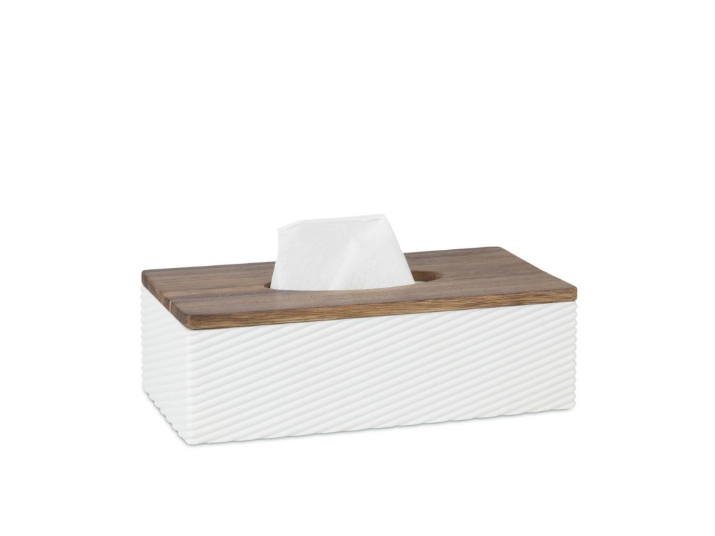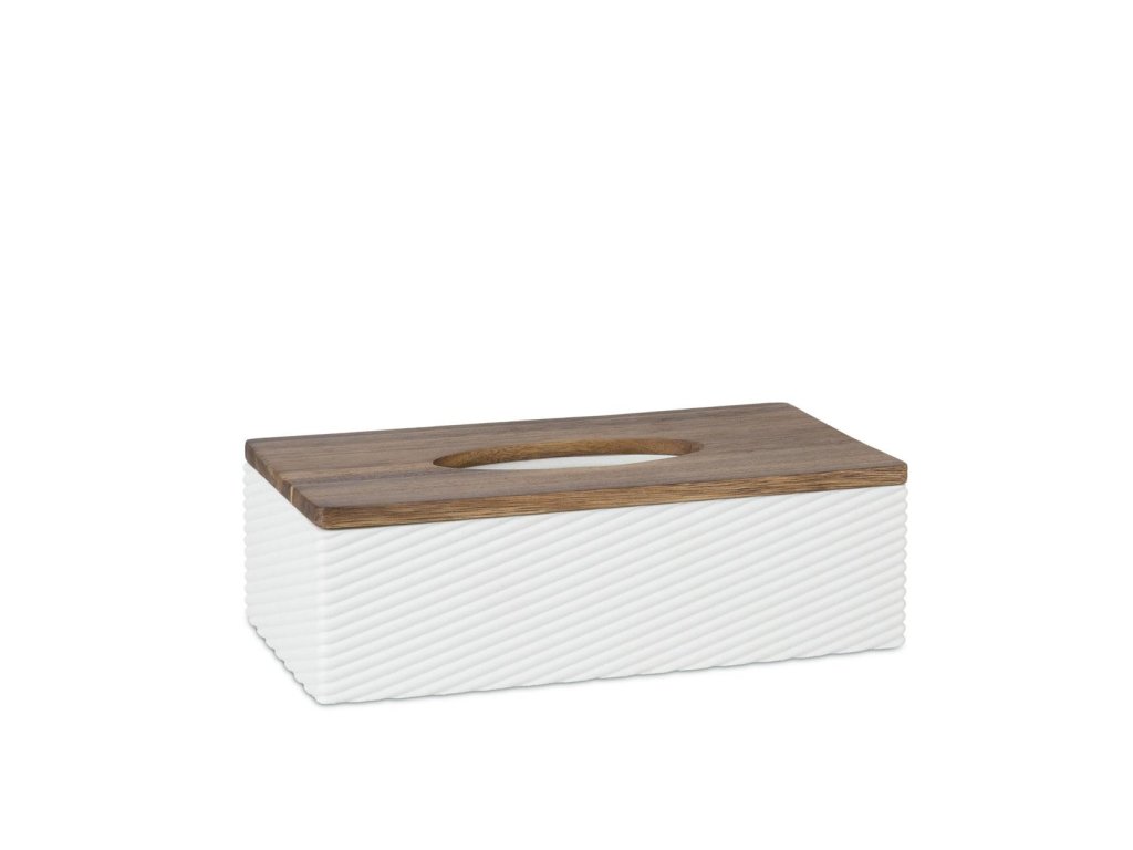 Dekorativní a praktický box na kapesníčky v sobě spojuje elegantní design a funkčnost. Matný bílý povrch s jemným diagonálním rýhováním propůjčuje výrobku moderní, ale zároveň klidný vzhled, zatímco vrchní víko z přírodního dřeva přináší hřejivý akcent a harmonii. Výřez ve víku umožňuje snadné vytahování ubrousků a zároveň působí nenápadně a čistě.