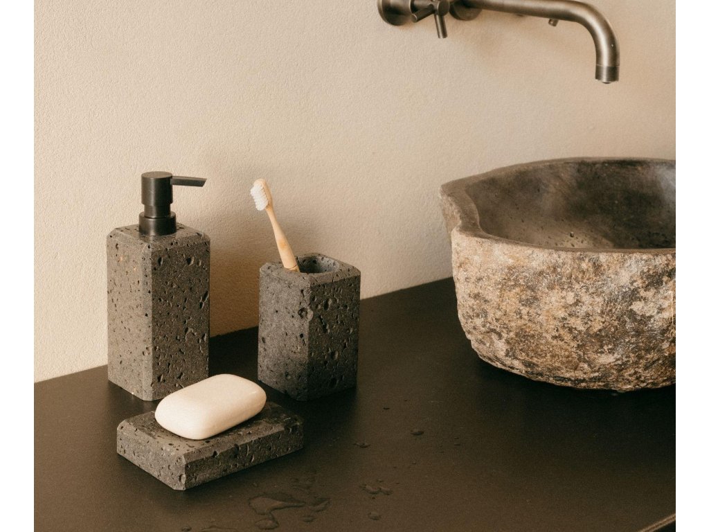 Doporučujeme kombinovat s dalšími doplňky ze stejného materiálu – mýdlenkou, dózou na kartáčky či podnosem z černého travertinu. Dávkovač výborně vynikne také vedle tmavých kovových prvků, matných povrchů a textilií v přírodních tónech (béžová, šedá, olivová). Vytvořte si sladěný set, který působí luxusně, ale zároveň přirozeně a nadčasově.