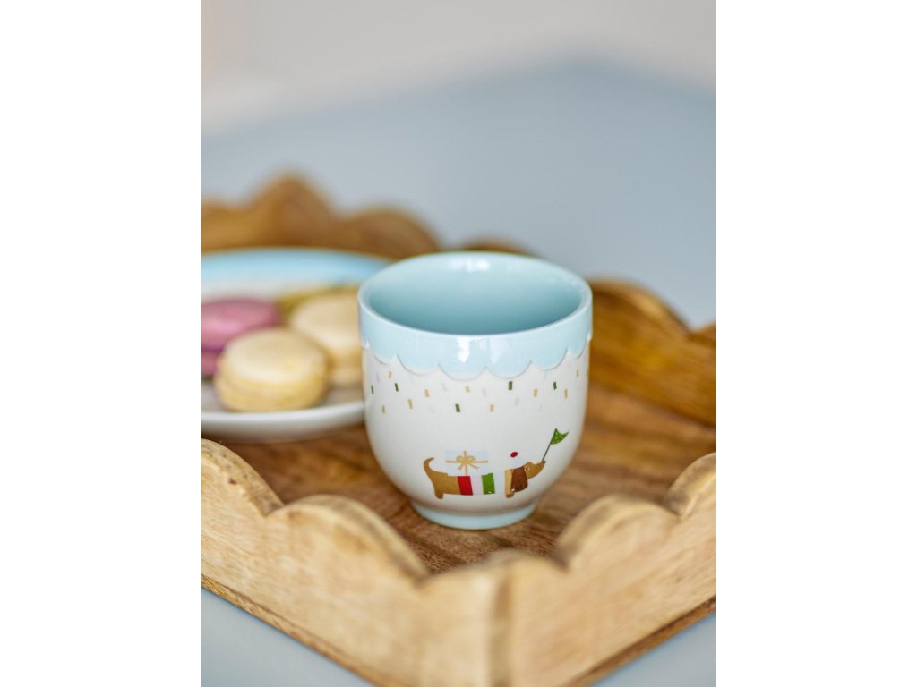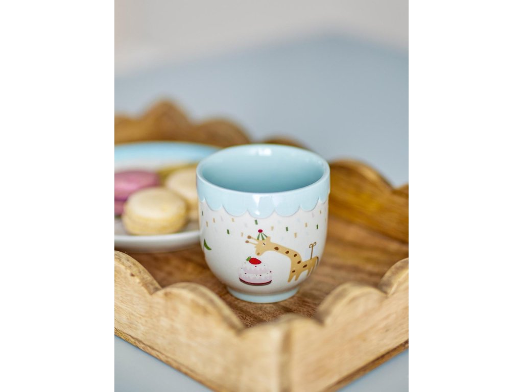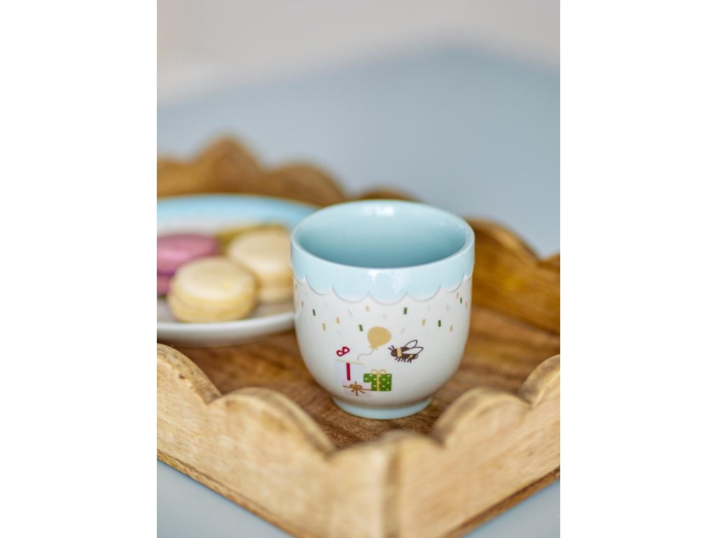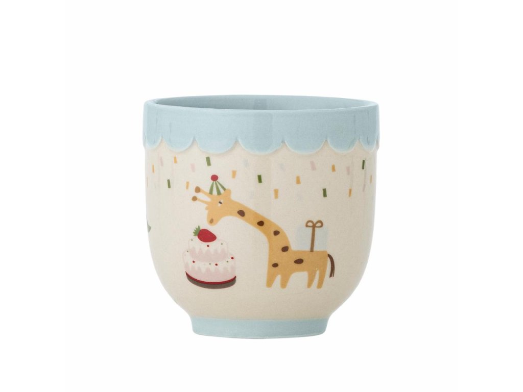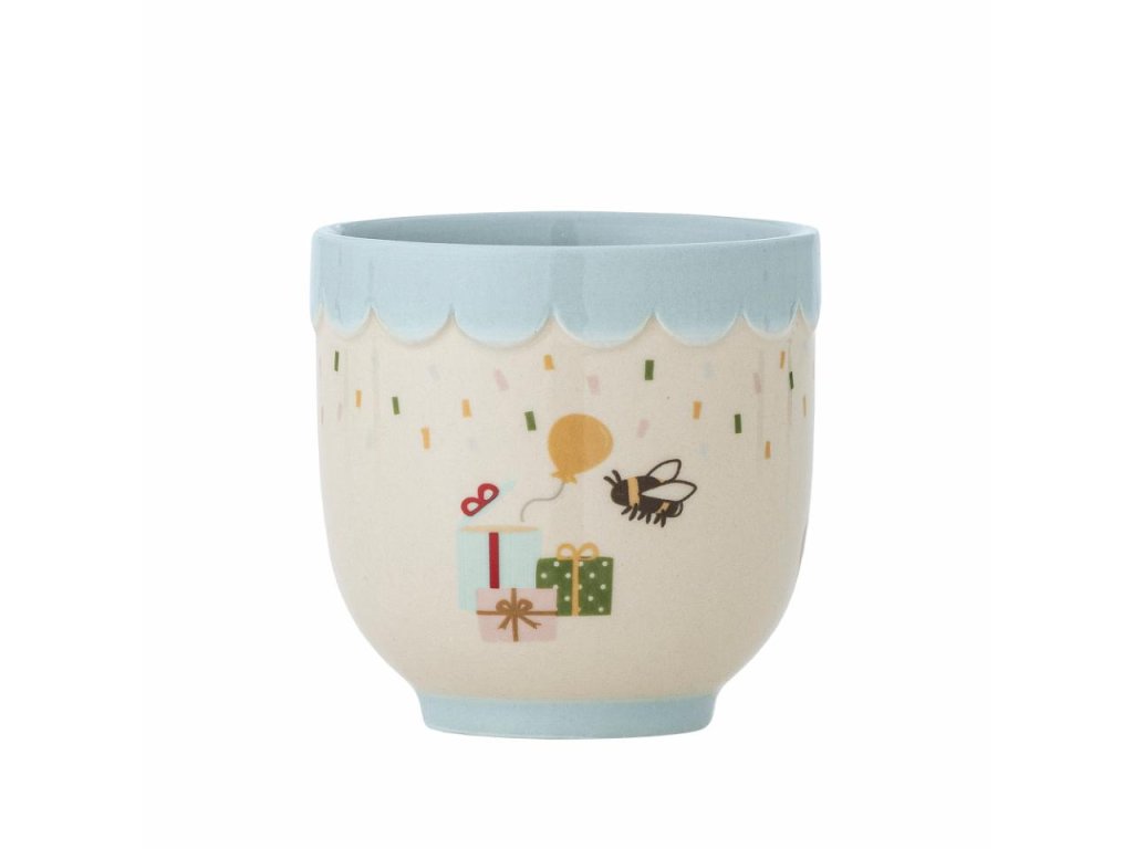 Dětský hrnek Celebrate od Bloomingville MINI vnese na každý stůl hravou a slavnostní atmosféru. Je vyroben z odolné kameniny a zdoben veselými motivy zvířátek, dárků a barevných detailů, které vykouzlí úsměv na tváři při každém použití. Kombinace krémového podkladu s jemně modrým okrajem a vnitřkem dodává hrnku svěží kontrast, který působí hravě a přitom jemně.