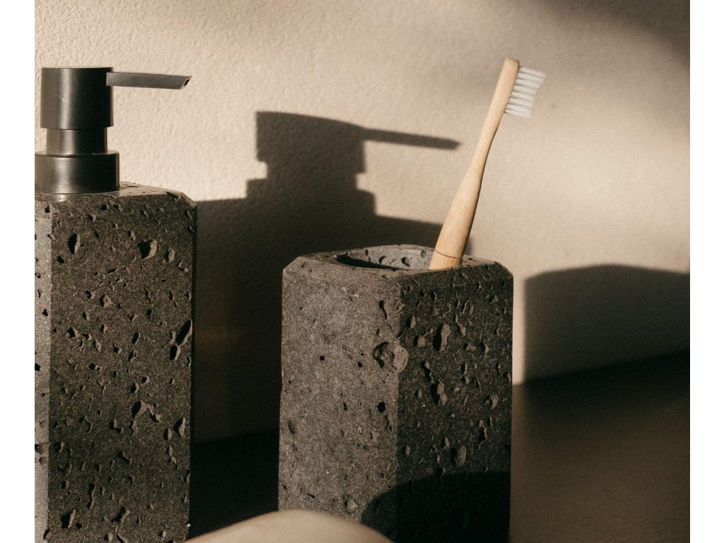 Přírodní travertin vyniká nejen vzhledem, ale také odolností vůči vlhkosti, díky čemuž je dóza ideální právě pro koupelnové prostředí. Stabilní základ zajišťuje pevné umístění na umyvadlové desce a díky dostatečně prostornému vnitřku pojme více zubních kartáčků nebo zubní pastu a další drobnosti.