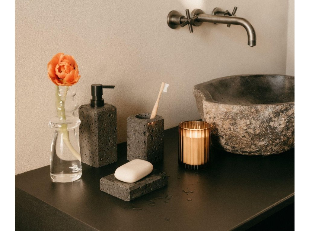 Skvěle ladí s dalšími doplňky z černého travertinu, jako je mýdlenka, dávkovač mýdla nebo podnosy. Pro sladěný a harmonický vzhled doporučujeme kombinovat s textiliemi v přírodních tónech, tmavými dřevěnými prvky nebo černým kovem. Společně tvoří harmonický celek, který zvýrazní charakter vaší koupelny a vnese do ní prvek přírodní elegance.