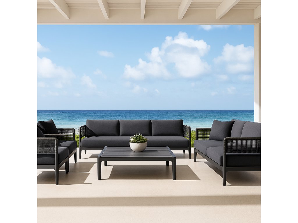 Zahradní set dvoumístné pohovky a jedné delší pohovky, dvou křesel a stolku Panorama tvoří konstrukce z lehkého a odolného hliníku v tmavé barvě antracitu. Pohovka i křesla jsou obložena polštáři a sedáky s výplní z odolného materiálu Olefin v antracitové barvě, , odolnému vůči UV záření a vodě. Opěrnou konstrukci zad a područek tvoří výplet z přírodního materiálu. Set pak doplňuje minimalistický konferenční stolek z antracitového hliníku. Set je ideální pro větší rodinu nebo skupinu přátel.
