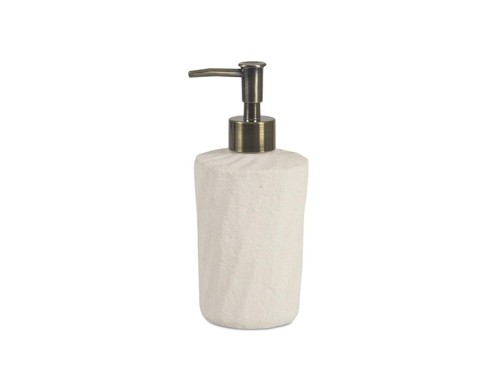 Organicky tvarovaný dávkovač mýdla s jemně zvlněným povrchem vnáší do koupelny estetiku inspirovanou přírodou. Strukturovaný matný povrch připomíná pískovec opracovaný větrem a vodou, zatímco vnitřní strana je hladká a glazovaná pro snadnou údržbu. Celkový dojem umocňuje elegantní zlatá pumpička z kvalitního ABS plastu, která dodává celku nádech luxusu, aniž by narušila jeho přirozený ráz.