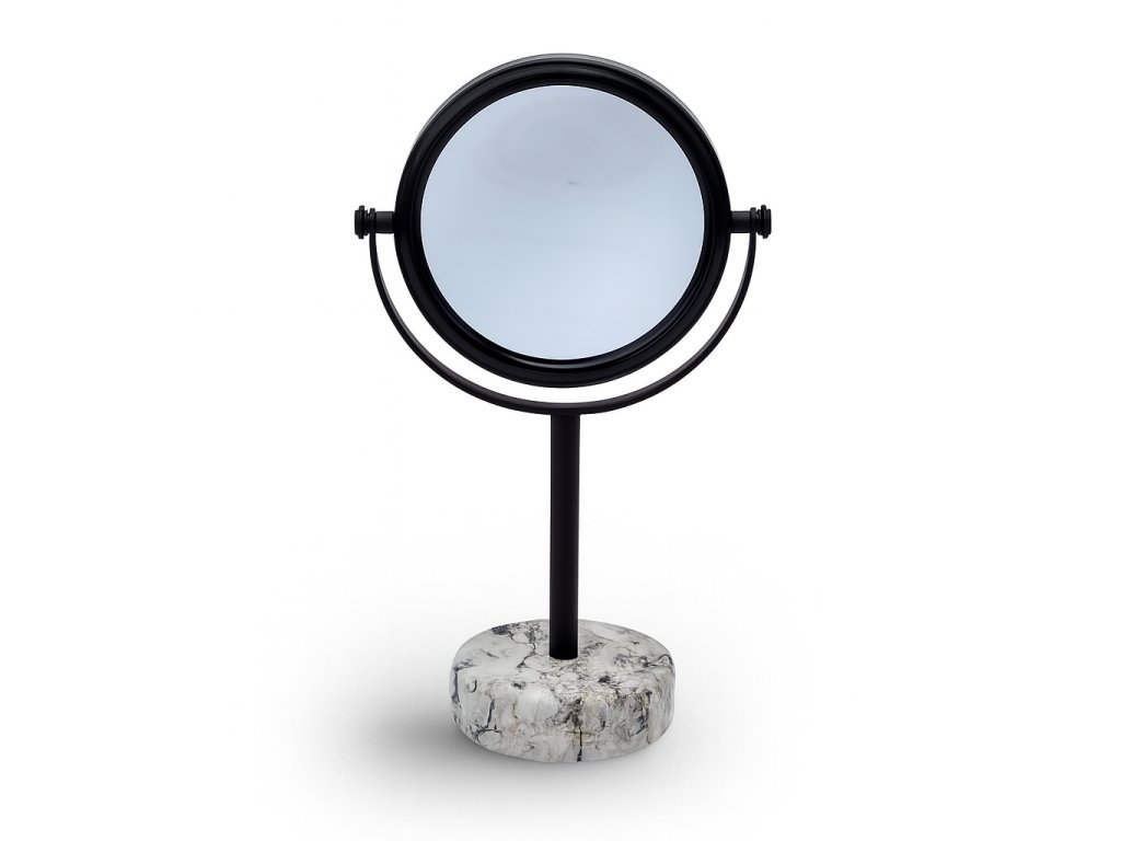 Elegantní kombinace přírodního mramoru a matné černé oceli činí z tohoto stolního zrcadla designový doplněk, který vynikne na každém toaletním stolku i v moderní koupelně. Stabilní mramorová základna zajišťuje pevnost, zatímco otočný rám umožňuje nastavit ideální úhel pohledu.