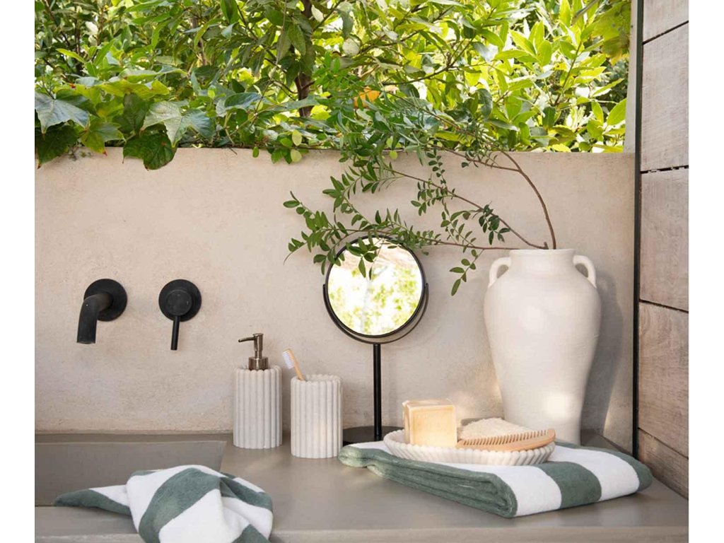 Pro ucelený vzhled doporučujeme kombinaci s dalšími prvky ze stejné kolekce – kelímkem na zubní kartáčky, krémovou mýdlenkou, dekorativním táckem nebo stojanem na WC štětku ve stejném rýhovaném designu. Vznikne tak sladěná sestava, která působí klidně, moderně a vkusně.