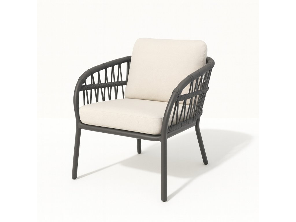Venkovní křeslo Tahiti je designovým kouskem, který spojuje moderní vzhled s maximálním pohodlím. Konstrukce z antracitového hliníku zajišťuje odolnost vůči korozi i náročným povětrnostním podmínkám, zatímco lehkost materiálu umožňuje snadnou manipulaci. Sedací a opěrné polštáře jsou vyrobeny z béžového Olefinu, high-tech textilie odolné vůči UV záření a vlhkosti. Výrazným prvkem jsou stylové výplety z textilních lanek v tmavě šedé barvě, natažené v kovových područkách a po celé zadní části opěradla. Tento výplet je z vysoce odolného materiálu, který je přizpůsoben venkovnímu použití – odolá větru, dešti i silnému slunečnímu záření a zároveň působí lehce a elegantně.