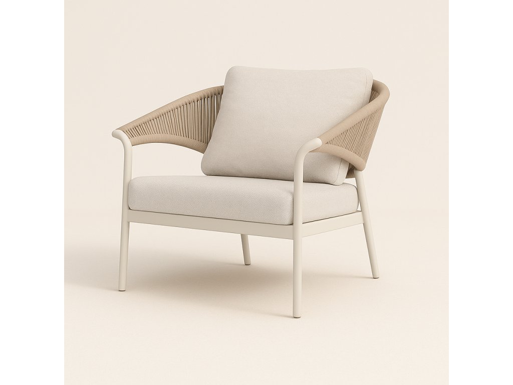 Venkovní křeslo Tonga je moderní a pohodlné křeslo s nadčasovým designem, které je ideální pro odpočinek na terase, zahradě nebo balkonu. Konstrukce z hliníku v bílém provedení je lehká, ale zároveň mimořádně odolná vůči vlivům počasí a korozi. Komfort zajišťují měkké, odnímatelné sedací a opěrné polštáře z kvalitního béžového Olefinu, který je známý svou odolností vůči UV záření i vlhkosti. Designovým prvkem křesla je elegantní výplet z odolného syntetického lana, který tvoří boční i zadní opěrku a dodává celku vzdušnost a atraktivní vzhled. Křeslo Tonga nabízí nejen pohodlí, ale i stylový doplněk pro každý venkovní prostor.