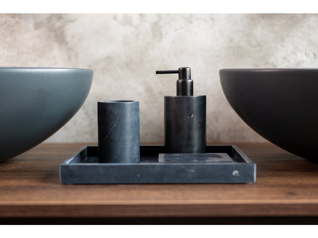 Podnos Obsidian Black nejlépe vynikne v kombinaci s černými či tmavě laděnými doplňky, ale krásně kontrastuje i se světlými kamennými deskami, betonem či přírodními materiály jako je akácie nebo ořech. Dokonale ladí s černými armaturami, industriálními prvky nebo minimalistickými koupelnami. Je ideální k setu Obsidian Black (dávkovač, mýdlenka) i k luxusním kontrastním doplňkům v odstínu Espresso Brown.