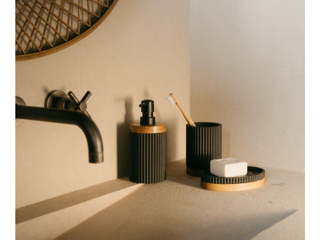 Tato designová mýdlenka skvěle ladí s dalšími doplňky ze stejné kolekce – například s dávkovačem mýdla, kelímkem na zubní kartáčky nebo úložnými boxy v černém a dřevěném provedení. Vytvořte si harmonický a elegantní set, který dodá vaší koupelně jednotný a nadčasový vzhled.
