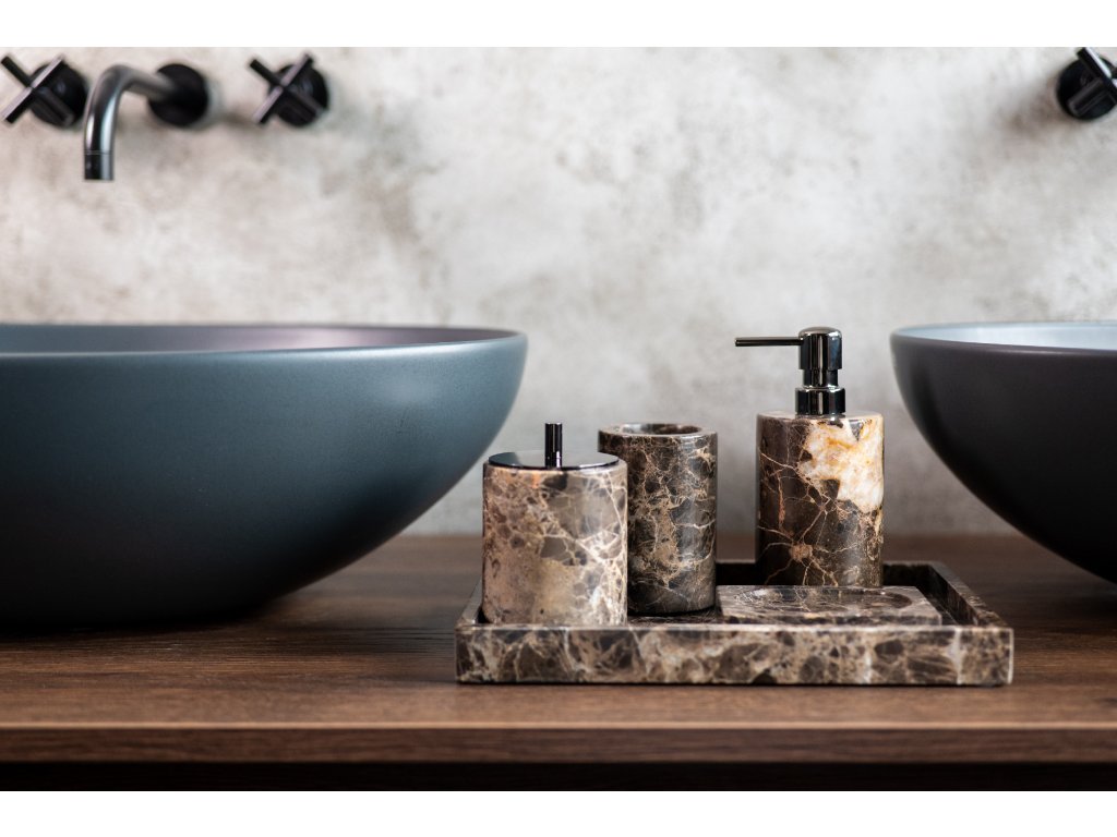Mýdlenka Espresso Brown krásně ladí s dávkovačem mýdla ve stejném mramorovém provedení a tvoří s ním harmonický set. Výborně se kombinuje také s doplňky v černé matné barvě, například s černými bateriemi, držáky ručníků nebo kovovými odkládacími miskami. V interiéru vynikne po boku přírodních materiálů, jako je akáciové či ořechové dřevo, a skvěle doplní prostory laděné do teplých zemitých barev nebo kontrastně vynikne v kombinaci s bílým či světlým kamenným umyvadlem.