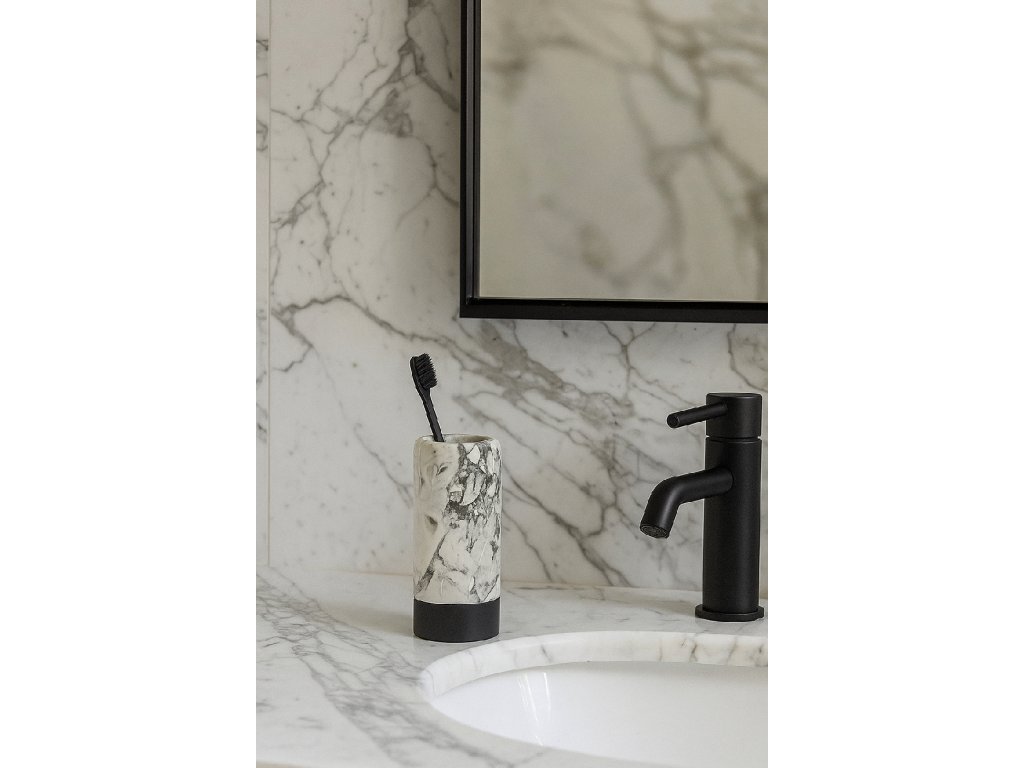 Dodejte své koupelně sofistikovaný vzhled s tímto elegantním stojanem na zubní kartáčky z pravého mramoru. Každý kus je originál s jedinečnou kresbou kamene, která vnáší do prostoru přírodní eleganci. Minimalistická černá základna zajišťuje nejen stabilitu, ale také kontrastní designový prvek.