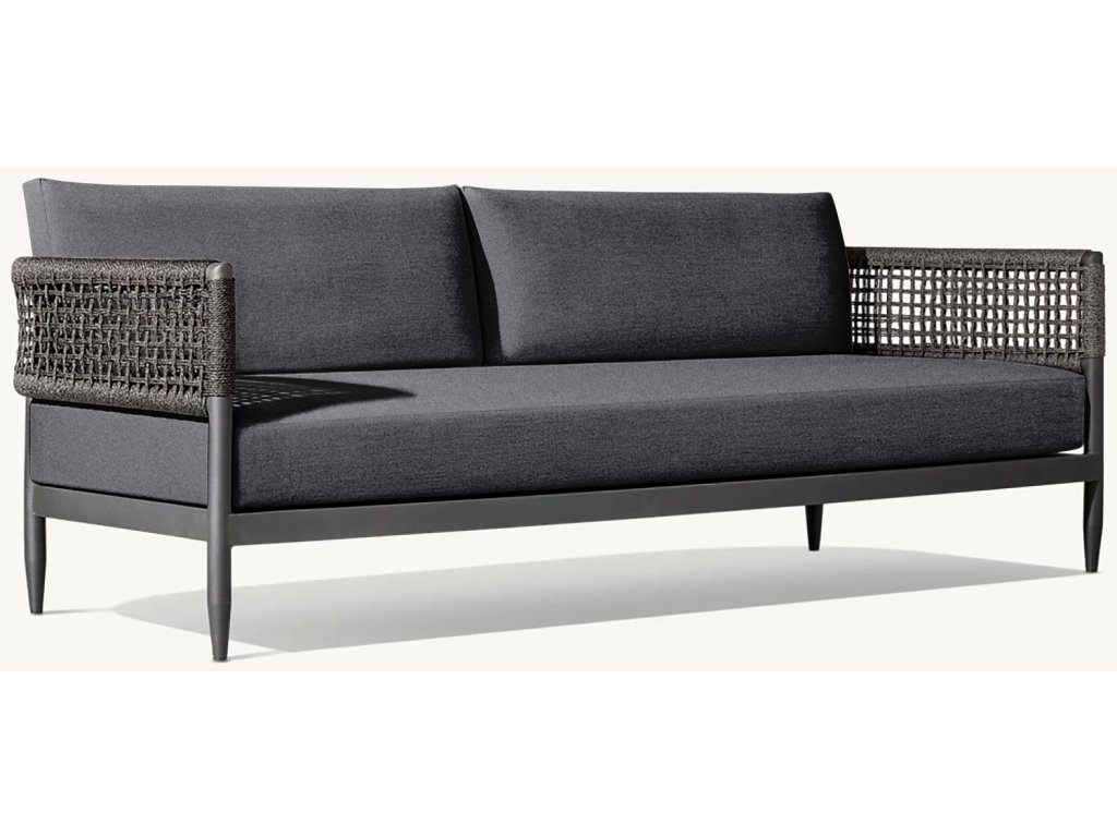 Zadní část pohovky i područky jsou vypleteny stylovým výpletem z přírodního vzhledového materiálu, který celé konstrukci dodává vzdušnost, moderní texturu a jemně exotický nádech. Spojením kovu, tkaniny a výpletu vzniká pohodlný, odolný a zároveň esteticky výrazný kus nábytku, ideální pro letní relax.