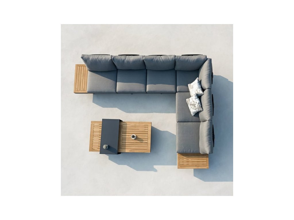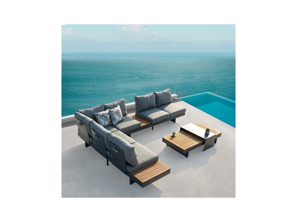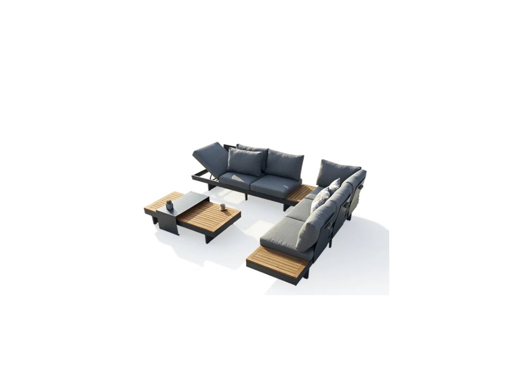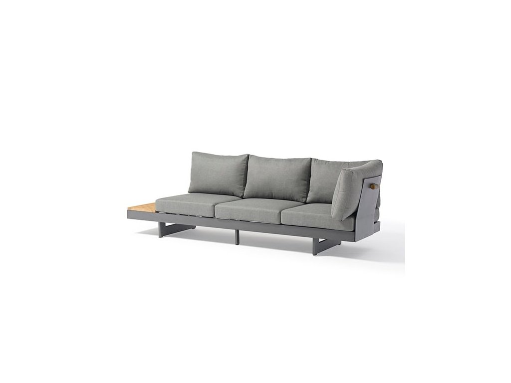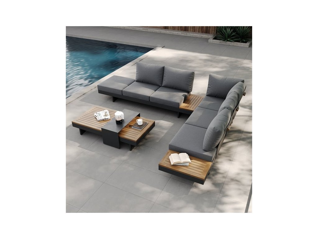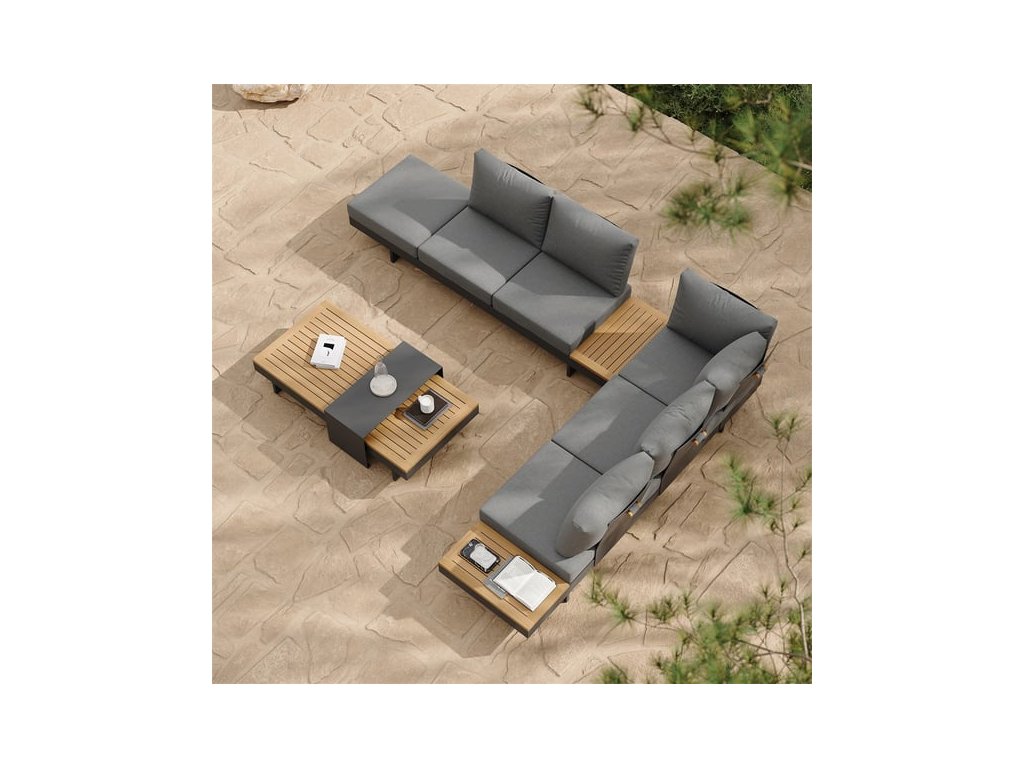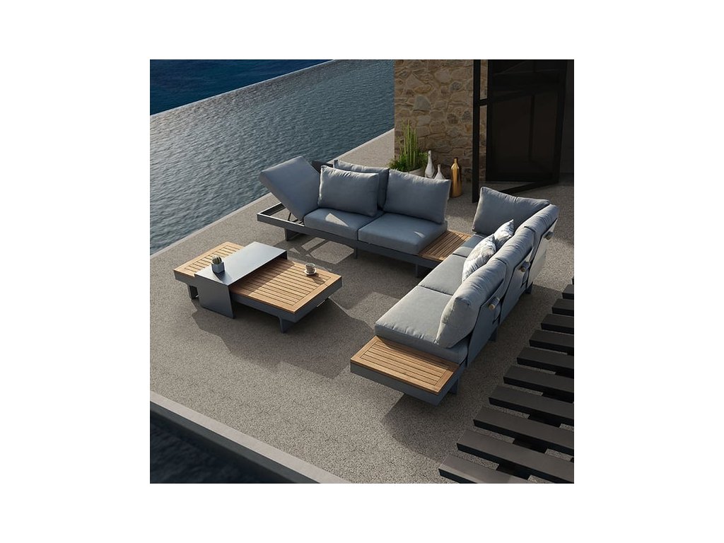 Venkovní pohovka Sky je mimořádně elegantním a variabilním prvkem moderního zahradního posezení. Je tvořena lehkou, ale pevnou konstrukcí z antracitově lakovaného hliníku, která je osazena odnímatelnými sedacími i opěrnými polštáři ze šedého OLEFINU – inovativního materiálu s vysokou odolností vůči UV záření a klimatickým podmínkám. Pohovku lze přizpůsobit aktuálním potřebám – využijete ji jako rohovou sedačku, dvě samostatné pohovky nebo pohovku a lehátko s polohovatelným koncem. Na straně nabízí prakticky integrovaný odkládací stolek, které je napojený přímo na konstrukci. Povrchy všech těchto prvků jsou z luxusního teakového dřeva, které dodává pohovce teplý a přírodní vzhled.