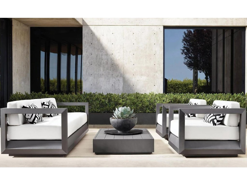 Minimalistická zahradní sedací souprava Boston tvoří trojmístná pohovka a 2 křesla, vyrobené z antracitového hliníku, která je pokryta sedacími odnímatelnými polštářky, včetně opěrných polštářů, z černého Olefinu, hitech materiálu odolného vůči UV záření a klimatickým jevům. Na bočních stranách mají stylové kovové područky. Pohovku a křesla doplňuje konferenční stolek v provedení z odolného hliníku. Díky tomuto materiálu je pak celá sestava odolná a lehká na manipulaci, avšak bytelná a kvalitní.