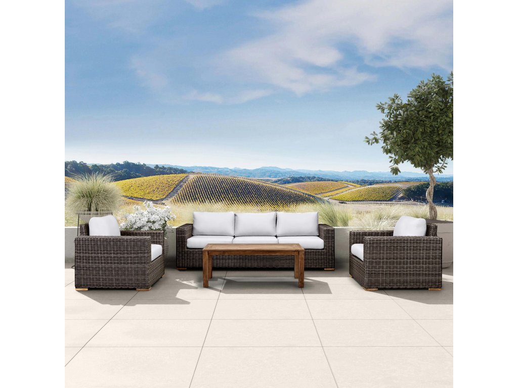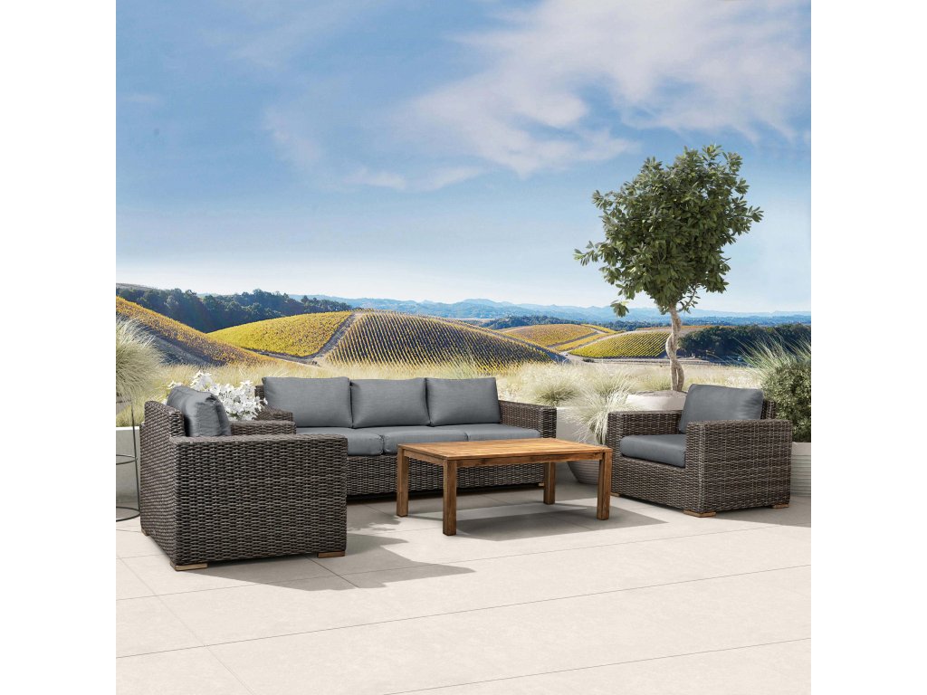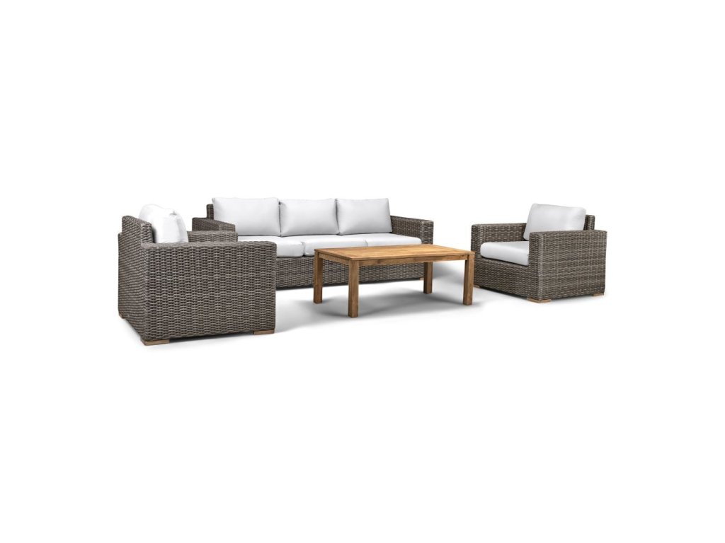 Designová ratanová souprava Brugy disponuje trojsedačkou a dvěma samostatnými křesly. Rámy soupravy jsou tvořené z robustního hliníku, dále sedákem, 2 opěrkami pro ruce, zadní opěrkou a 4 masivními nohami. Sestava je pokryta proutím z umělého ratanového vlákna a polštářky na sezení a opření povlakem z hitech materiálu Olefin, odolného vůči vodě a UV záření. Díky své šířce poskytuje sedačka i křesla maximální pohodlí pro letní posezení vaší rodiny. Sestavu doplňuje lounge stolek z pravého teaku.