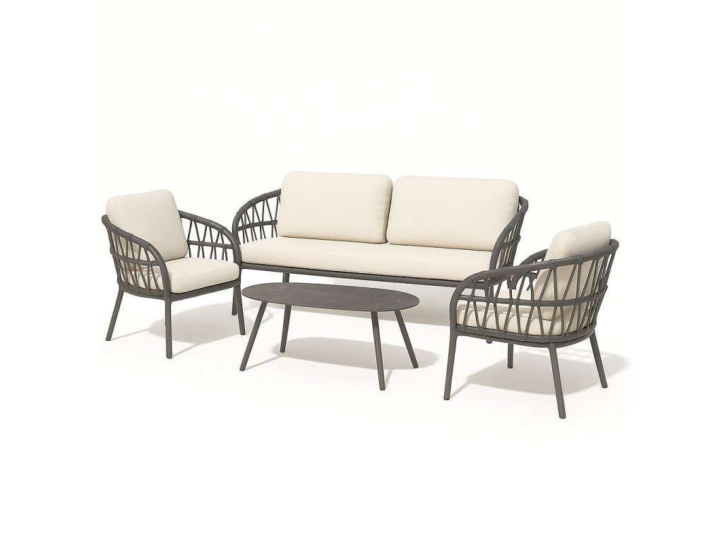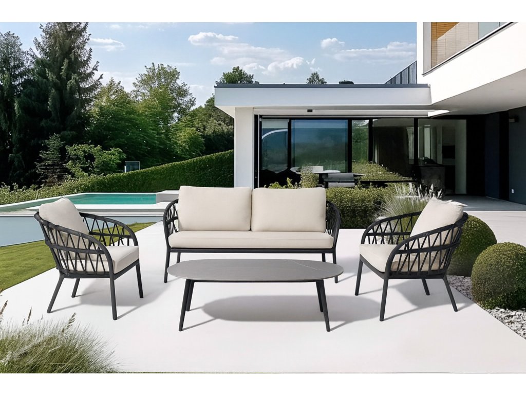 Luxusní zahradní set Tahiti tvoří dvoumístná pohovka a 2 křesla, vyrobené z antracitového hliníku, která je pokryta sedacími odnímatelnými polštářky. včetně opěrných polštářů, z béžového Olefinu, hitech materiálu odolného vůči UV záření a klimatickým jevům. Na bočních stranách mají stylové kovové područky, v nichž jsou natažena krásná textilní lanka v tmavě šedé barvě. Pohovku a křesla doplňuje konferenční stolek v provedení antracitového hliníku, deska stolu je vyrobena z umělého kamene, který v sobě snoubí krásou pravého kamene, avšak bez jeho křehkých vlastností. Umělý kámen je tak ideální kombinací pro zahradní sestavy, vystavené náročným podmínkám. Díky materiálu hliníku jsou odolné a lehké na manipulaci.