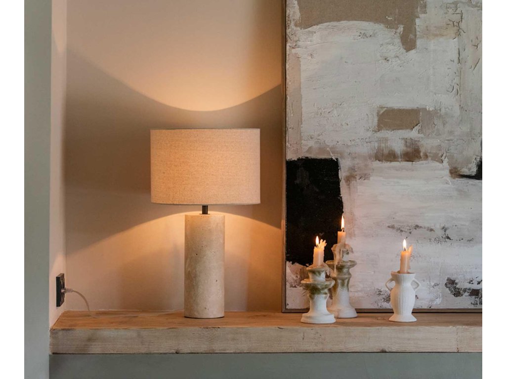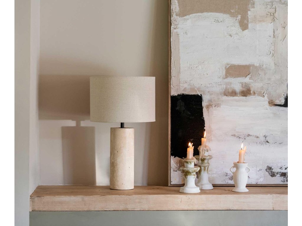 Světle béžový travertin s jemnou přírodní kresbou krásně kontrastuje s textilním lněným stínidlem, které rozptyluje světlo do měkkého, příjemného tónu. Lampa tak vytváří útulnou atmosféru a zároveň působí velmi sofistikovaně. Díky čistým liniím a neutrálním barvám se snadno kombinuje s moderním, minimalistickým, přírodním i elegantním interiérem.