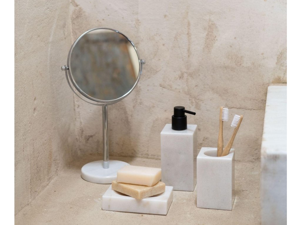 Minimalistická kovová konstrukce v lesklém chromovém provedení v kombinaci s těžkým mramorovým základem zajišťuje stabilitu, trvanlivost a nadčasový vzhled. Díky otočnému mechanismu lze zrcadlo snadno přizpůsobit požadovanému úhlu. Ideální velikost pro běžné i detailní použití.
