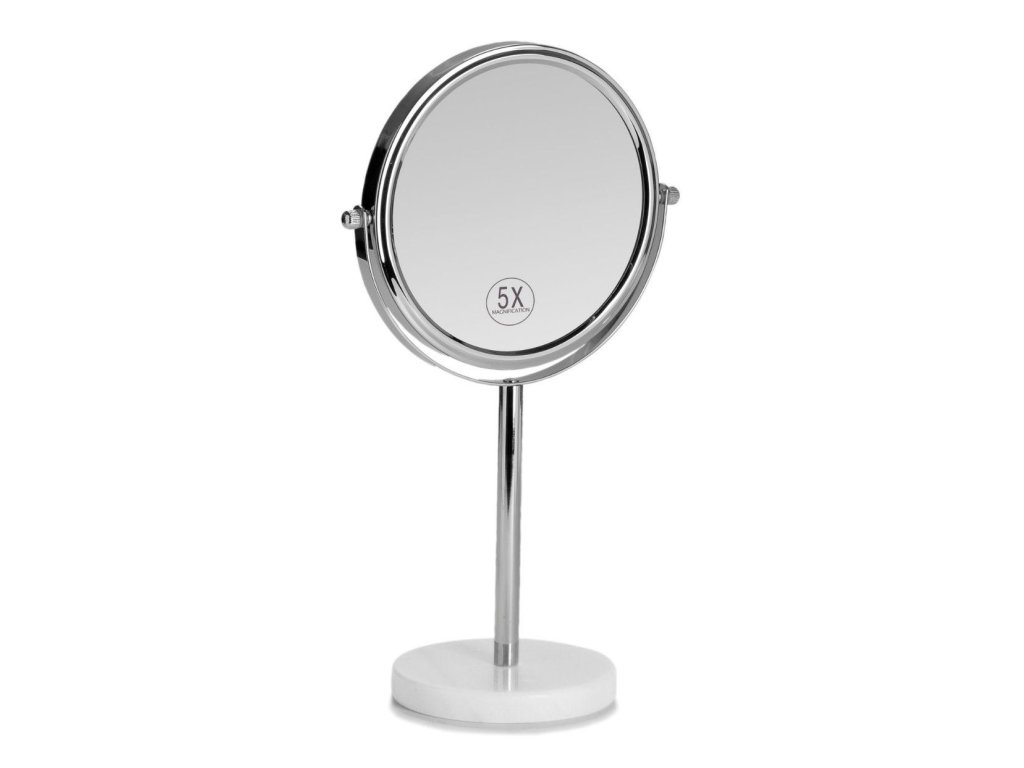 Elegantní spojení funkčnosti a estetického detailu. Toto oboustranné kosmetické zrcadlo s podstavcem z přírodního mramoru představuje stylový doplněk pro každodenní péči o pleť, líčení nebo detailní úpravy. Jedna strana zrcadla nabízí klasický odraz, druhá pak 5násobné zvětšení pro precizní pohled i na ty nejmenší detaily. Zrcadlo je díky nadčasovému designu vhodné do moderních i klasických interiérů.