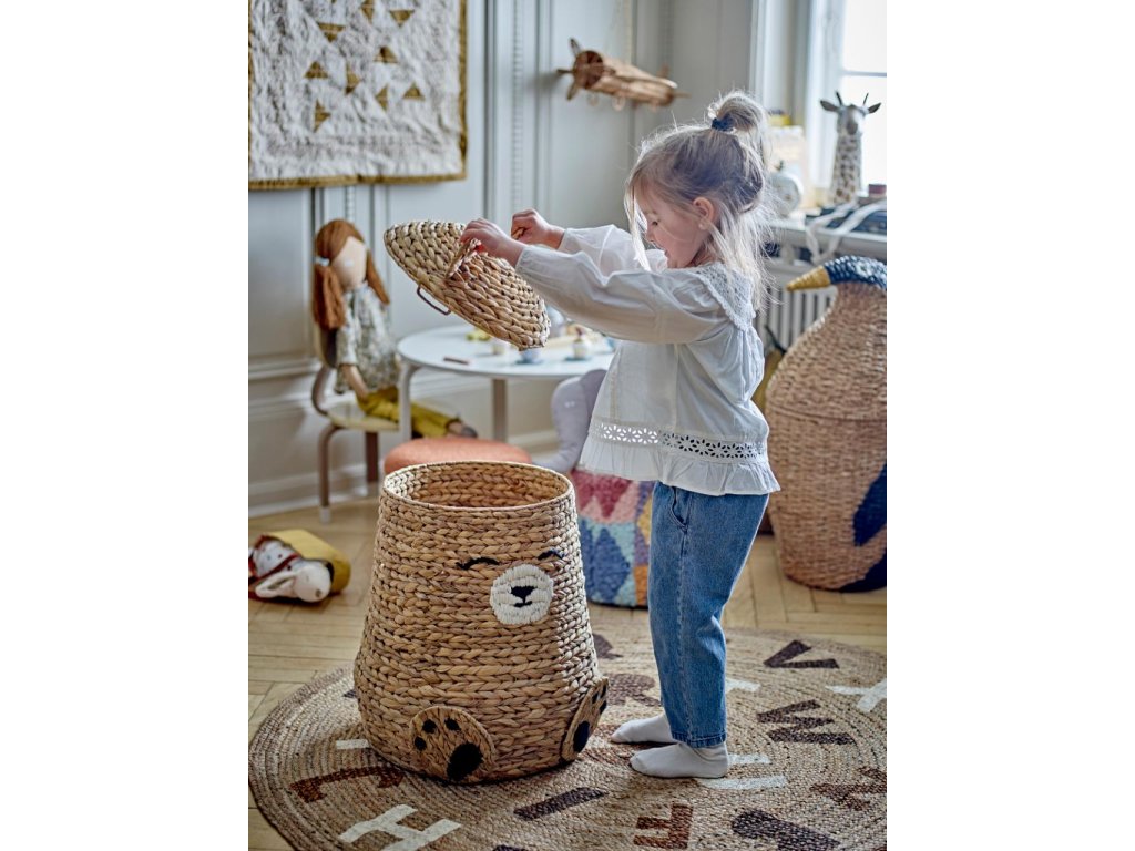 Součástí koše je originální víko ve tvaru medvědí hlavičky s oušky. Prakticky schová veškerý obsah uvnitř, a zároveň může sloužit jako malý odkládací stolek na knížky, lampičku nebo dekorace. Díky této funkčnosti se koš stává nejen úložným prostorem, ale i stylovým prvkem dětského interiéru.