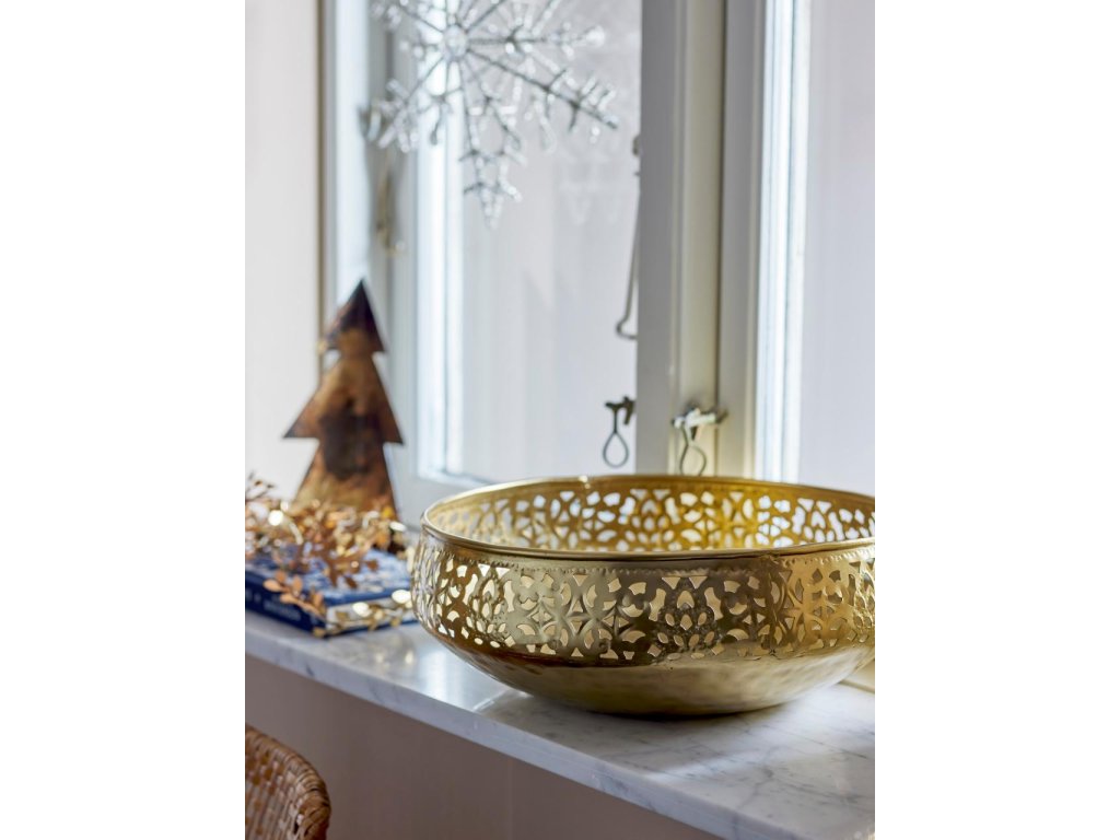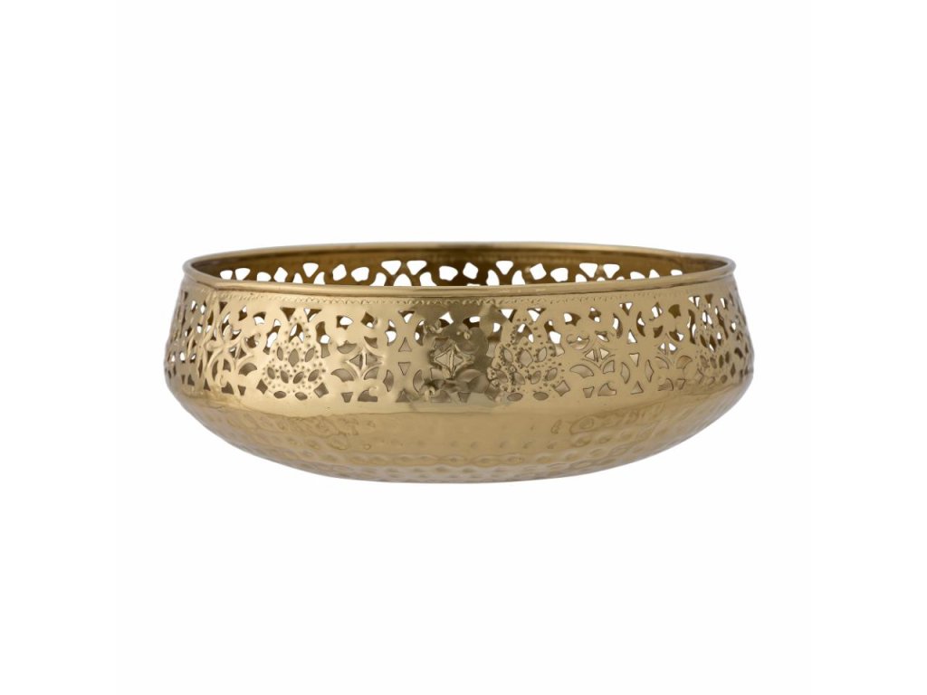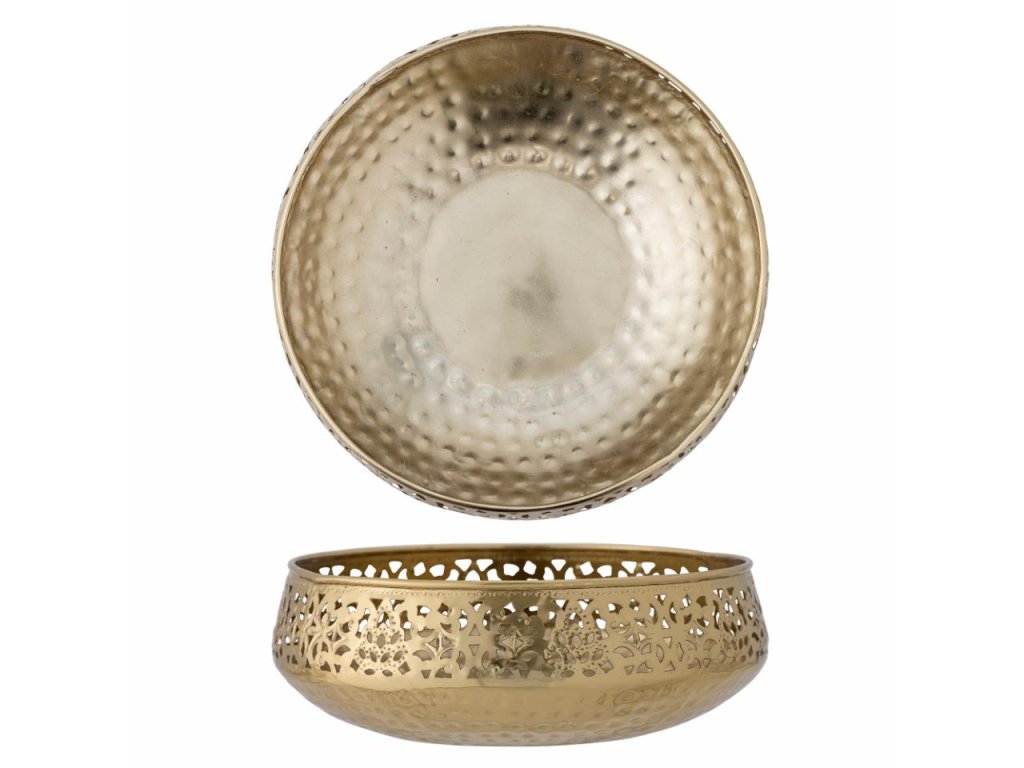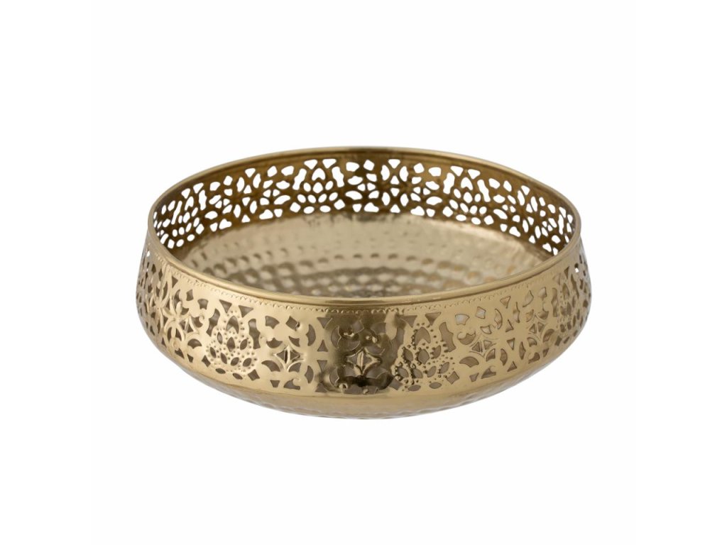 Dekorativní mísa Aisha z lakovaného kovu ve zlatém odstínu okouzlí svým jemně tepaným povrchem a orientálním výřezem, který do interiéru vnáší špetku exotického kouzla. Díky svému většímu průměru je nejen výrazným designovým prvkem, ale i mimořádně praktickým doplňkem pro každodenní použití.